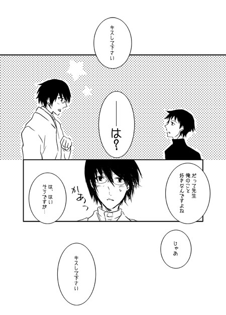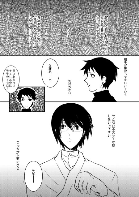 というか参考にしようと思って望准の創作を見て回ったら思いの外先生が鬼畜でなんだか涙が出そうだったので先生は悪気無しのピュアピュアにしました。好きになっちゃってどうしようどうしようって思ってたら体が勝手に動いちゃったみたいな。タチ悪いですね← 久藤君も誘い受けなんだけど結局健気くさいです。准望だと久藤君真っ黒なイメージなんですけど…受けになったらなんか白くなりました